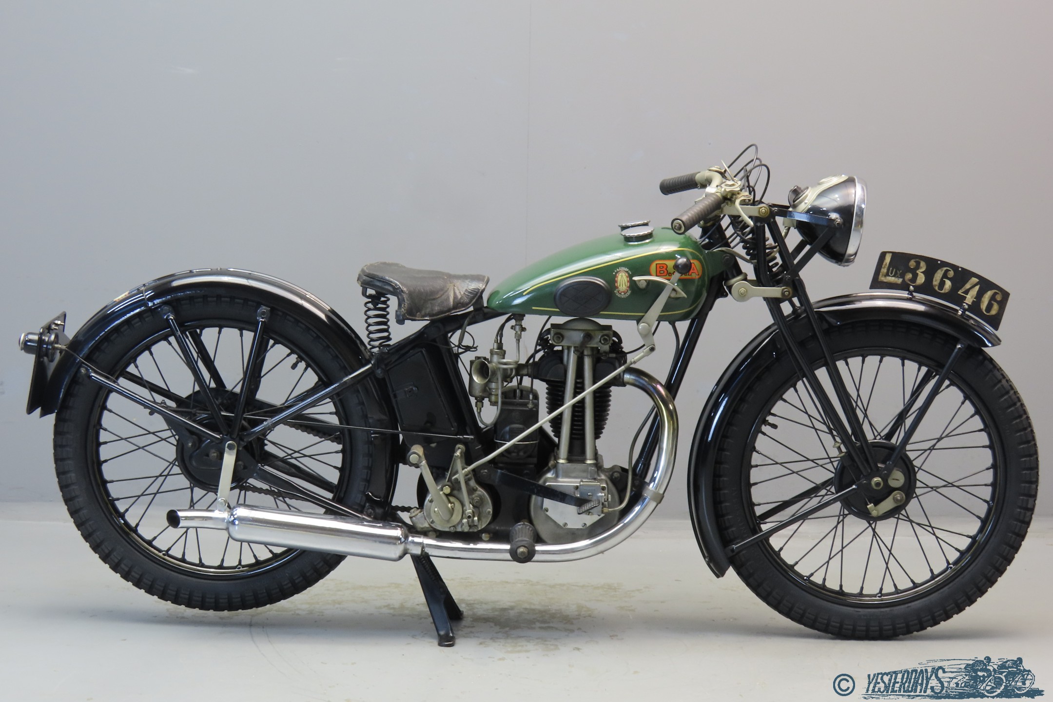 BSA’s 1933 range comprises models from 249 cc till 986 cc. The model ranges get a letter code: “B” for 249 cc, “R” for 348 cc, “W” for 499 cc, “M” for 595 cc and finally “G” for the big 986 cc twin. Three types of machines are offered in the “B” class, all with bore x stroke dimensions of 63×80 mm. The B33-1 is a side valve machine, the other two have overhead valves. The B33-3 is the “Blue Star” Sports version with tuned engine, full cradle frame and high-level exhaust. The B33-2‘s introduction in the catalogue reads: “This is the model for the man who wants a fast, light machine with low running costs. It is fine value for money, the price including M.L. Electric Lighting Equipment.” Advantage of the B33-1 and B33-2 models is that they qualify for the low 30 shilling tax rate.