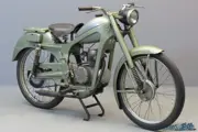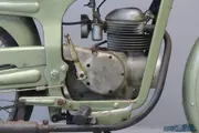 Named after the roe deer, the Capriolo marque emerges in 1948 from the ashes of the giant Caproni group, formerly one of Italy’s largest manufacturing concerns. Capriolo starts two-wheeled production with a 50 cc ultra-lightweight before moving on in 1951 to the 75 cc Capriolo 75, which is notable for its use of a pressed-steel frame and an unusual four-stroke engine of the overhead ‘face cam’ type. By 1955 the Capriolo 75 had sold 25,000 units, and gained laurels in competition including the Motogiro and the Milan-Taranto. In 1956 new models were introduced that had a modified pressed steel frame and a different type of engine. The machine we offer has been stood for a number of years and will need attention. She’s essentially complete, missing some control cables, but the engine runs fine. Power delivered is ca 3.5 hp, top speed about 80 km/h.