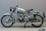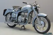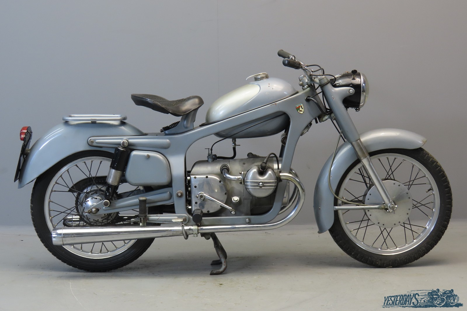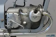 Named after the roe deer, the Capriolo marque emerges in 1948 from the ashes of the giant Caproni group, formerly one of Italy’s largest manufacturing concerns. Capriolo starts two-wheeled production with a 50 cc ultra-lightweight before swiftly moving on to the 75 cc Capriolo 75, which is notable for its use of a pressed-steel frame and an unusual four-stroke engine of the overhead ‘face cam’ type (a picture of the face cam mechanism is shown at end of the video). At the Milan Show in November 1953, Capriolo launches its bigger brother the Cento 50, one of the very few Italian motorcycles to be powered by a horizontally opposed engine. This has bore x stroke dimensions of 43 x 47 mm and delivers 8 hp @ 6000 rpm, good for a top speed of about 95 km/h. The final drive goes via chain and this little Italian represents the only example of such a small OHC face-cam opposed twin engine in the motorcycle engineering world. The frame is also unusual, pressed steel frames were popular in the prewar years but less common in the 1950s. The Cento 50 ( “hundred fifty”) was only produced for about two years and it appears that less than 500 left the factory. Note the comfortably-looking Aquila “Anatomica” saddle. In 1958 the factory name changes from Caproni to Aeromere, but the Capriolo name is kept for the motorcycles. 1964 is the last year that motorcycles are produced.