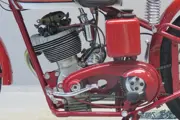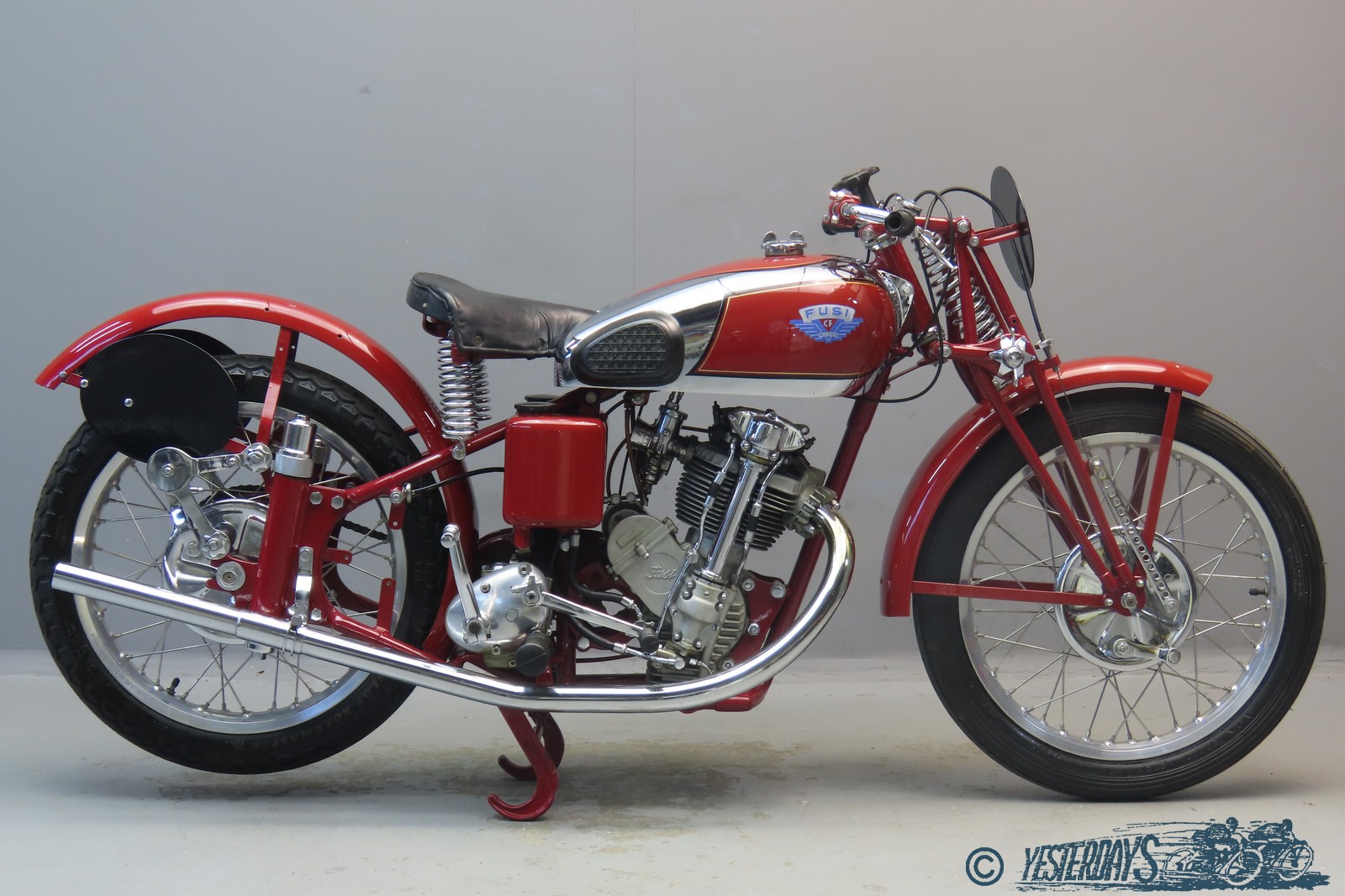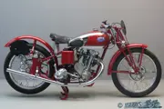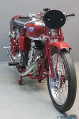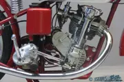 They were very successful in racing. In 1937 the CF factory was taken over by the Fusi firm, which were the Italian FN importers. Next to the racing types with face cam engine, Fusi produced machines with J.A.P. engines that were built in Italy under licence. Fusi used gearboxes that were actually Burman designs produced under licence by FIAT. This beautifully restored piece of engineering has a four speed foot change gearbox and square engine dimensions of 68×68 mm. Two separate oil tanks are fitted, and the lubrication of the valve gear is effected through external oil pipes. Hairpin valve springs are employed, the cylinder has a forward slope of 15 degrees and the machine has rear springing with friction dampers. Power developed is given as 17 hp @ 7000 rpm, top speed is around 135 km/hour.