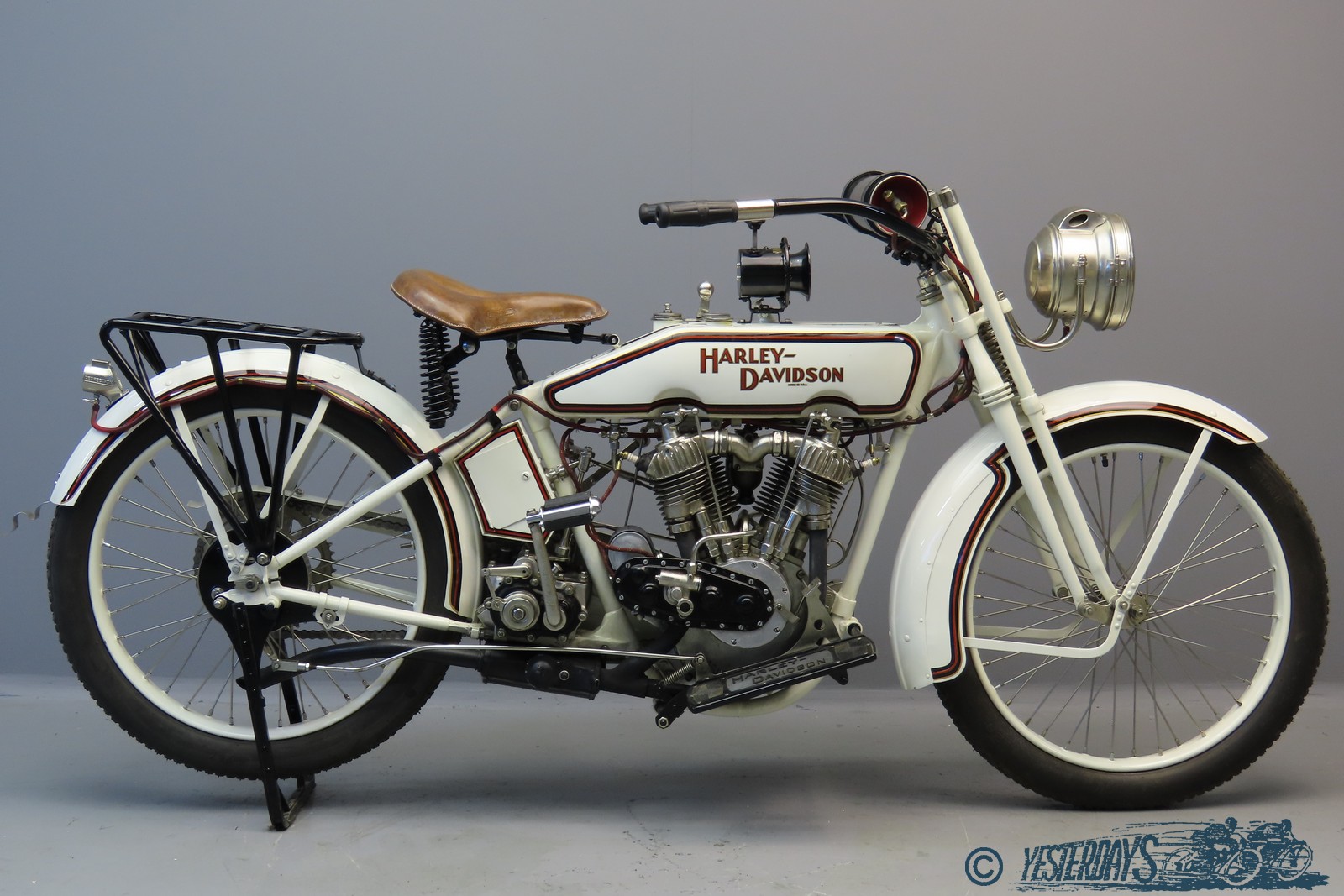 1909 marks the appearance of Harley-Davidson’s first v-twin, though it’s not until the adoption of mechanically operated inlet valves in 1911 (replacing the ‘atmospheric’ type inherited from the single) that production really takes off. This ‘F-head’ (inlet-over-exhaust) engine will remain in production for the next 19 years. Year by year the models are further developed and in 1921 a larger-capacity 1212 cc engine becomes available alongside the well-tried 989 cc power source. New features for the 1921model year are one-piece tubular steel handlebars and full valances on the front mudguard.