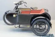 The combination we present is an older restoration that comes with Powell & Hanmer acetylene lighting system, Bosch magneto, Eversure bulb horn, internal expanding band brake to the rear wheel and sprung footboards.