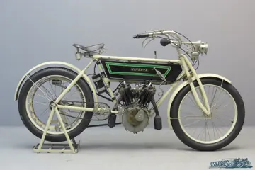 In 1900, the firm bought an engine from the Neuchâtel – Swiss based Zürcher & Lüthi. Zürcher & Lüthi did not only build the engines, they also patented the bicycle set-up. The engines were “clamped to the framing” (clip-on). S. de Jong & Co. bought the license and started the production of all parts needed to turn a Minerva bicyclette into a Minerva motocyclette. Due to the reliability of the clip-on engine, success was immediate. In 1905 Minerva introduced a V-twin for sale to the public. The clip-on had been deleted from the production program. 1907 was the last year of the square-shaped petrol tank; for the 1908 model year a cylindrical type of tank was introduced. For model year 1907 four models were marketed, three singles of 254, 345 and 433 cc and a V-twin of 577 cc. The 4 ½ HP twin has bore x stroke of 70×75 mm and had detachable cylinder heads. In 1908 a second V-twin would become available, with a capacity of 855 cc.