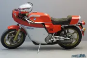 But the public demanded something more exciting from many-times World Champions MV, and the company duly obliged: at the Milan show in November 1969 the new 750S was presented. The capacity was upped to 743cc and the 65×56 bore x stroke engine now delivered 69hp @ 7900rpm. Four 24mm Dell’Orto carburettors were fitted and a Grimeca 8-inch four leading shoe acted as front stopper. The front brake was changed to hydraulic dual-discs in 1974. The new 750S got a striking appearance with its red, white and blue colour scheme and its distinct petrol tank shape. Perhaps surprisingly for a sports model, it retained the shaft final drive of the 600 while the frame too was virtually identical to that of its predecessor. Hand made in limited numbers and priced accordingly, the 750S was way beyond the financial reach of the average enthusiast.