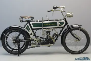 The first NSU V-twins are marketed by the end of the Summer of 1905. Two models are presented, in capacities of 450 and 662 cc. The rear cylinder is placed in an upright position and the front cylinder is tilted 60 degrees forward, to ensure proper cooling of both cylinders. The inlet valves are not mechanically controlled but rely on atmospheric pressure. The following years various capacities are offered in the V-twin range, with a 752 cc model topping the range in 1907.