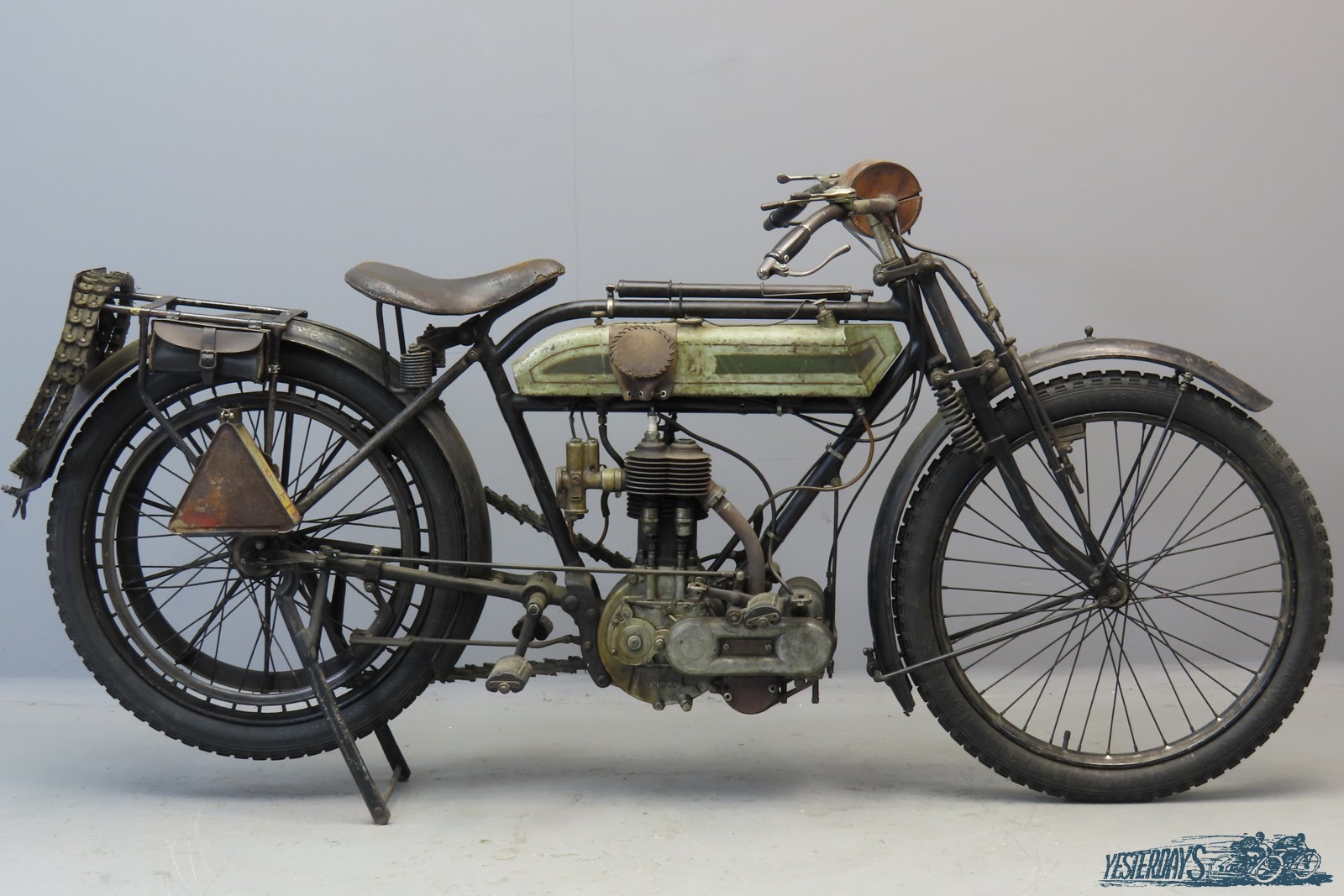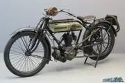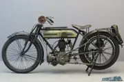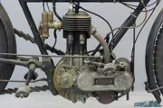 The machine we present here is a bit of a “special”: the frame number refers to a very late 1911 model of which the seating position has been lowered, This was done in a professional way, probably when the machine was only a few years old; from 1914 this lower position was standard and quite a few older bikes were modernised at the time. Instead of the usual Triumph front forks this machine has been fitted with Druid forks, possibly to acquire a better roadholding for fast riding. The rear frame is the standard frame for a machine with pedalling gear, but at the pedal gear position a set of footrests is fitted. A practical fitting is the hub clutch, so that the engine can be kept running when the machine is stationary. The engine was assembled in January, 1914. This authentic “special” with weathered look is in good technical condition and comes with Pioneer Certificate, sports handlebars, spare tube carrier, two sets of footrests, leather kneepads, spare belt and triangular spare oil can.