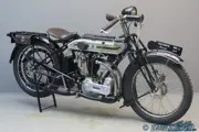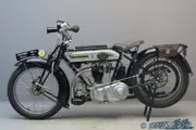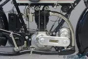 The four valves were not arranged radially but were set two by two and the heads were sunk below the level of the combustion chamber so that the first part of the opening and the last part of the closing were practically ineffective; cam design was such that the valves were gently started and gently seated, and the idea was that the effective valve opening and closure was sudden. An effect of this design was that the valve operation was very quiet. When testing for the 1921 TT the rocking front fork (already used by Triumph from veteran days) proved unsuited for high speeds, so side spring Druid forks were fitted. The new machine did not prove very successful in the race but the Ricardo went in production for the 1922 season. In the next few years a lot of development work was done to the engine but that never led to real racing successes. As a sporty touring mount the Ricardo was more successful and it stayed in production till 1927. This goodlooking vintage sports machine has undergone an extensive high-quality restoration some 30 years ago and is in excellent condition; the electric wiring is fitted but needs to be connected. She comes with Stewart 60 mph speedo, top tube mounted “Triumph” tyre pump and Lucas bulb horn. The Lucas electric lighting system, at the time an expensive luxury, was a standard fitting to the Ricardo.