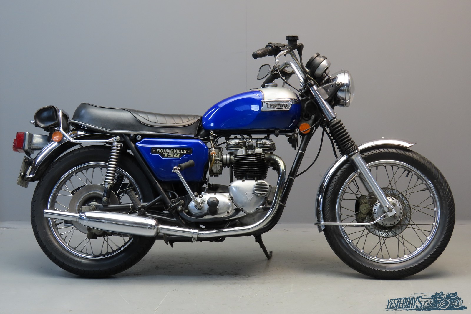 The 649 cc capacity production T120 Bonneville was replaced in the early 1970s by the T140 Bonneville, the same basic machine but with a 750 cc class engine. Refined from the later ‘oil in frame’ version of the T120, the first few T140s, designated T140V, featured a larger-capacity engine of 724 cc, a five-speed gearbox and indicators, but still retaining drum brakes and kick-start. Shortly after, the engine was further bored out to 744 cc and front disc brakes were fitted (using single discs until 1982). While originally intended for ‘export only’, the 750 Bonneville twin caused so much interest among visitors to the 1973 motorcycle shows, that Triumph decided to put the bike on the home market at the price of 679 UK pounds. In 1975, along with engine modifications, the gearchange lever was moved from right to left to comply with new regulations mandated for the American market and a rear disc brake fitted. Several T140 models followed, featuring various modifications and refinements including electric starting from 1980 until production ceased with the closure of the Meriden works in 1983.