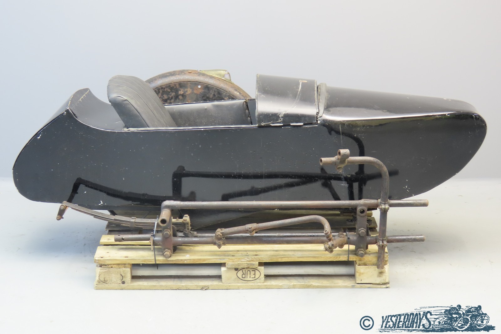 This sidecar model was popular in the thirties. The boot is in good condition and is constructed of wooden ribs with metal panelling and leatherette seat cover. The chassis can easily and quickly be fitted to and taken off a motorcycle, this was a handy feature when a machine was used both as a solo mount and as a combination. The chassis and mudguard are unrestored, the mudguard is adorned with a nicely designed Art-Deco-type lighting unit. The sidecar wheel is not complete, there’s a hub and a wheel rim. The dimensions are approximately 200 x 110 x 80 cm.