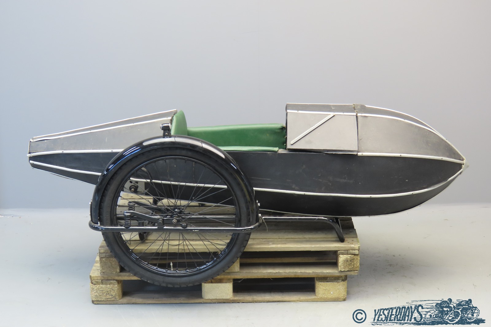 The Zeppelin airship inspired many sidecar designers and producers and from the early 1920s they were often seen attached to a motorcycle, often a sports machine. The chassis of the sidecar we offer here has both coil and leaf spring suspension, the wheel and mudguard are freshly painted. The boot is constructed of wooden ribs with plywood panels, that are covered with leatherette. Aluminium strips that run to the central “bullet point” In the front accentuate the sleek shape of this interesting design. Dimensions are approximately 230 x 100 x 75 cm.