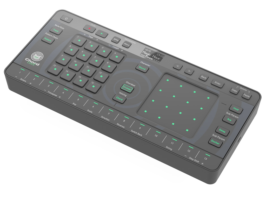 ChordCat is uitgerust met 145 preset-sounds en 16 drumkits die gesequenced kunnen worden via de 128-stappen sequencer. Deze beschikt over 8 tracks met 16 patronen per track. De sequencer wordt bediend met het raster van 16 knoppen aan de linkerkant, terwijl het XY-pad aan de rechterkant gebruikt wordt om parameters in verschillende modi te bewerken. De rij van 13 knoppen aan de onderkant kan fungeren als een conventioneel keyboard of gebruikt worden om akkoorden in een sequence te triggeren.