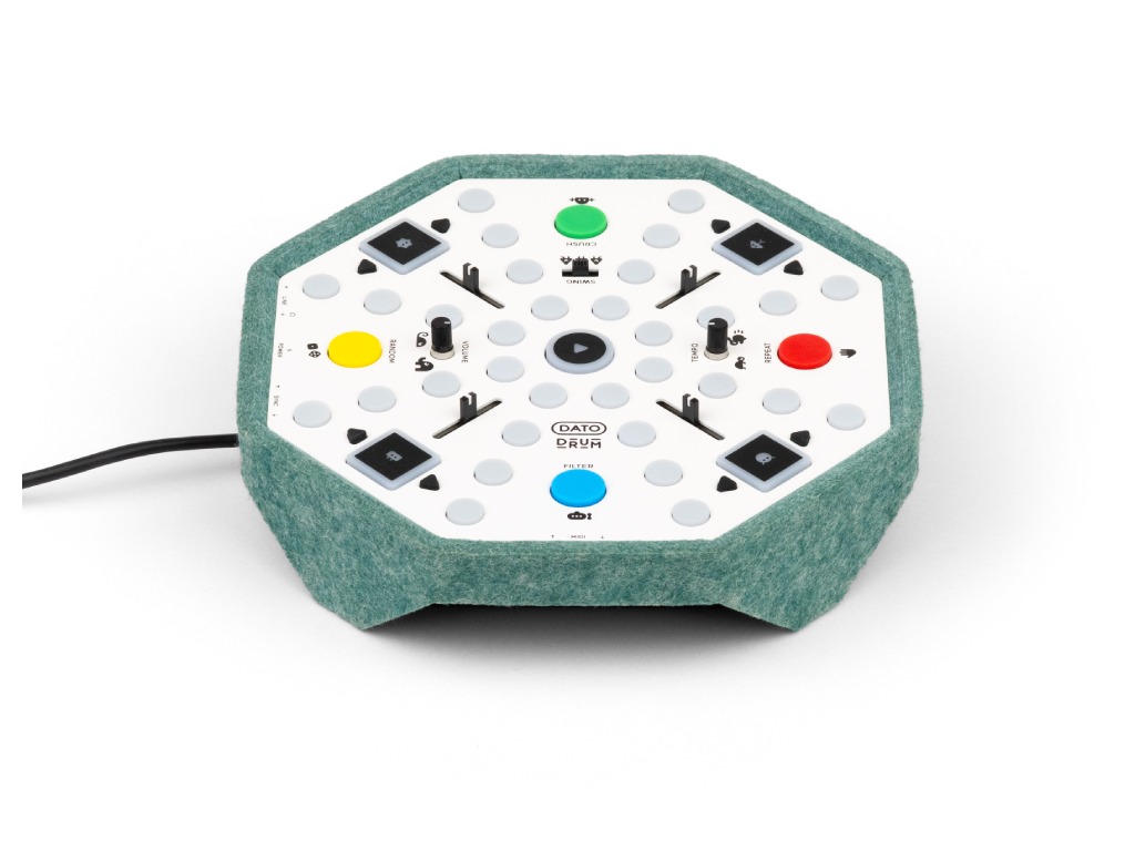 Door de simpele en directe bediening is de Dato DRUM leuk voor kinderen, maar de eigenzinnige manier van sequencen maakt hem ook interessant voor ervaren muzikanten. De drumcomputer heeft een stevige metalen behuizing met een zachte vilten rand en een ingebouwde speaker, zodat je overal in huis direct samen muziek kunt maken.