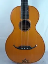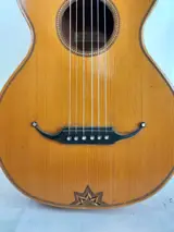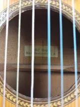 de tafel is van vurenhout met inlays op het klankbord, met name rond het klankgat en aan de achterkant van de tafel, zichtbaar op de foto.