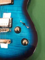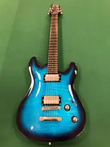 DIABLO SUPREME - D-serie - 6-snarige elektrische gitaar - Structuur: vaste hals - Body: mahonie met gevlamd esdoorn bovenblad - Hals: mahonie - Toets: ebbenhout - Scale: 25,5" - Radius: 12'' - 22 frets - Inlays: Dot - Pickup: 1x Framus 100 (hals) + 1x Framus 400 (brug) - Bediening: 1x Volume + 1x Tone + 3-standenschakelaar - Brug: Tune'o'Matic - Mechanieken: Framus - Topkam: Graphite - Finish hardware : Chroom - Kleur: Gebleekt Ocean Blue Burst Transparant - Afwerking: Glanzend - Inclusief gevoerde tas.
