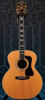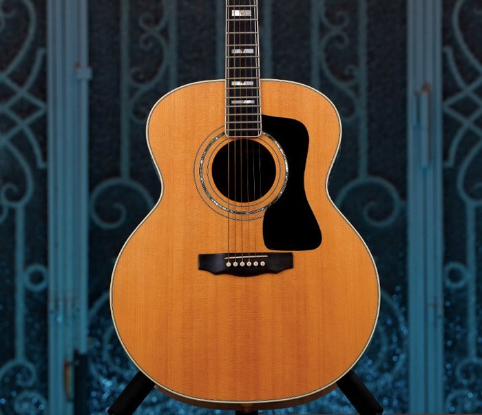 Deze Guild akoestische gitaar was eigendom van en werd bespeeld door Robin le Mesurier, de beroemde gitarist die met name speelde met Rod Stewart, Ron Wood en Johnny Hallyday.
