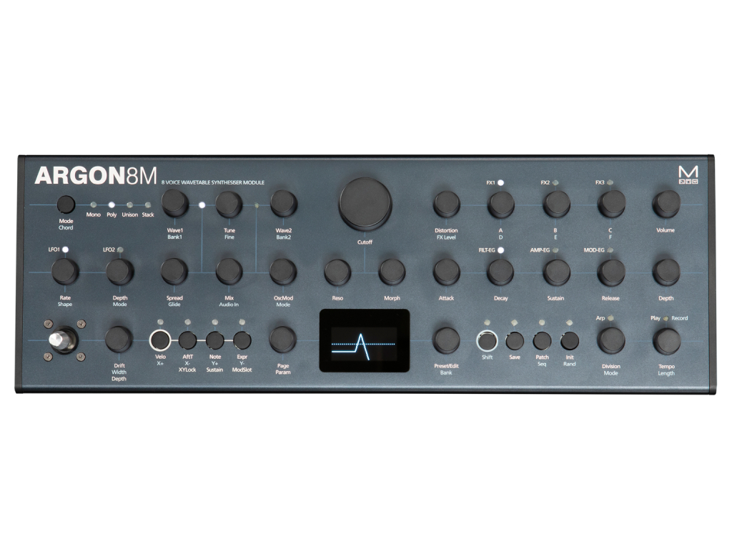 Modal heeft de Argon8 lijn uitgebreid met deze module. De module is te gebruiken als desktop en als rackmount! Deze wavetable synthesizer beschikt over 8 voices en 120 wavetables die zijn verdeeld in 24 banken van 5 waveform sets waardoor deze synth een ware goudmijn is voor sound designers. De Argon8M beschikt over 26 endless knobs, 9 knoppen en een X/Y joystick voor modulatie en pitch. Ook zitten er een ingebouwde 512 step real time sequencer en 32 step arpeggiator in. Hierdoor kun je tot 2048 stappen generen voordat er herhaling optreedt. Er zitten 300 factory presets in en zijn er 200 open user slots waar je je eigen creaties in op kan slaan. Daarnaast is het mogelijk om het scala aan patches uit te breiden door middel van de MODALapp. Deze is te verkrijgen plug-in voor Mac en PC en als app voor iOS en Android. De robuuste stalen en aluminium behuizing zorgt ervoor dat de Argon8 sterk staat op elk bureau of in elk rack. De opties zijn eindeloos!