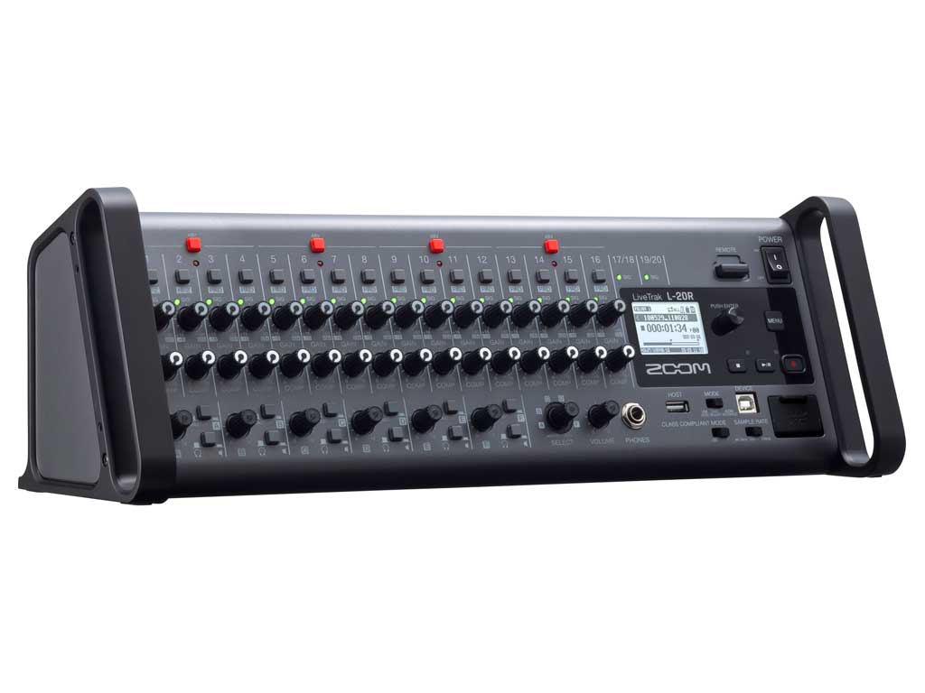 De Zoom LiveTrak L-20R is een vernieuwende rack-mount mixer van Zoom waarmee artiesten nu zelf op het podium live hun mixen aan kun passen. Doordat de mixer veel aansluitingen heeft, is hij goed te gebruiken op vrijwel alle podia. Ook mooi aan deze mixer is dat je een live mix per kanaal en met een stereo mix van het totaal op kunt nemen op SD, waarna je het over kunt zetten naar je DAW om het nog terug te beluisteren en eventueel te editen. Ook is de Zoom LiveTrak L-20R te gebruiken als externe geluidskaart (via USB) met maar liefst 22 high-end ingangen en 4 uitgangen.