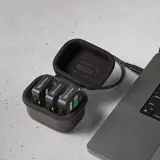 Met ruimte voor twee zenders (TX) en één ontvanger (RX) laadt de Charging Case+ je volledige Wireless GO III-set tegelijkertijd op. Dankzij de ingebouwde batterij kun je tot twee volledige laadcycli uitvoeren zonder dat je een stopcontact nodig hebt-perfect voor op locatie of onderweg.