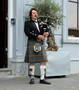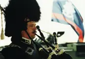 Gekleed in Schotse ruiten met glimmendeversieringen, de doordringende bekoring van het geluidvan de Schotse doedelzak, de lucht vullend en het publiek betoverend.