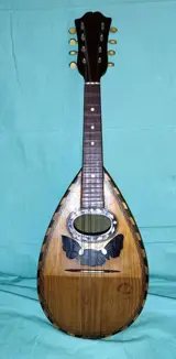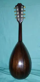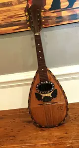 Sicilië, Italië, te koop een prachtige mandoline uit het begin van de 20e eeuw, gemaakt in Catania door de beroemde vioolbouwer Mazzullo Rosario Angelo en zonen. Instrument gemaakt met kostbare houtsoorten (mahonie, walnoot, resonantiespar), ivoren knoppen en parelmoer inleg, allemaal volledig origineel, een meesterwerk van de oude Italiaanse en in dit geval Siciliaanse gitaarbouwerskunst. Hoogte 62 cm, maximale breedte 16 cm