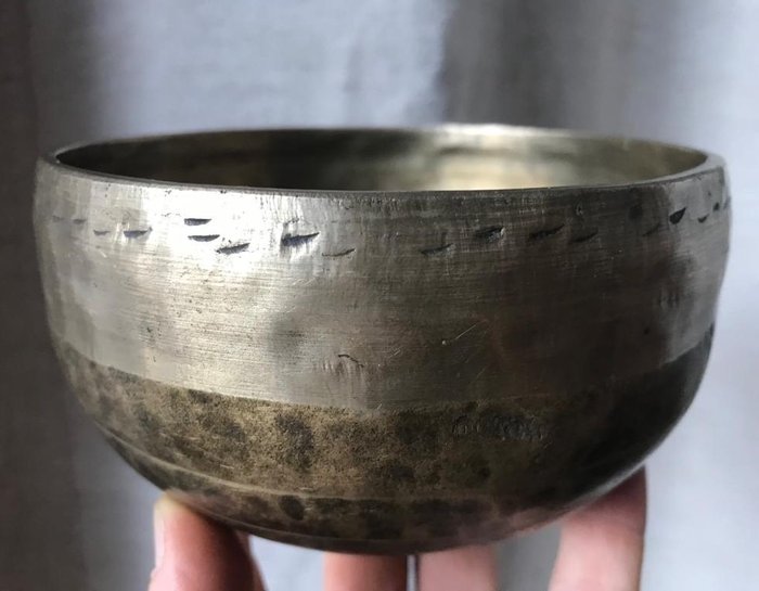 Een set van 3 kleine en oude tibetaanse klankschalen die mooi bij elkaar passen. Zeer verschillende modellen maar dezelfde stijl (kleine thadobati), allemaal met verschillende decoraties, sommige zijn vaag, sommige meer zichtbaar.