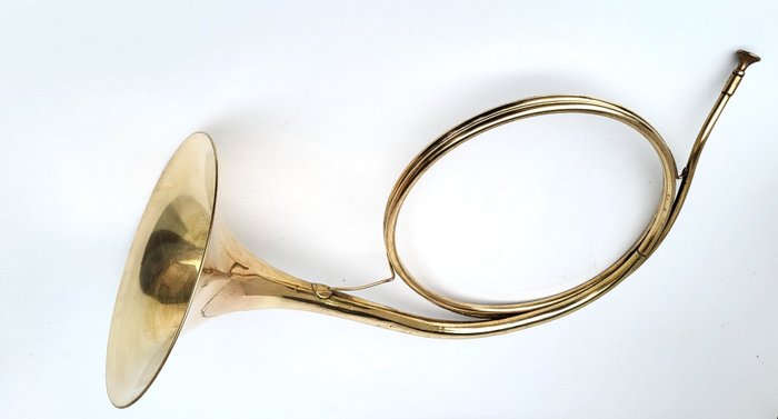 Prachtige koperen jachthoorn voorzien van een bronzen mondstuk in perfect werkende staat.