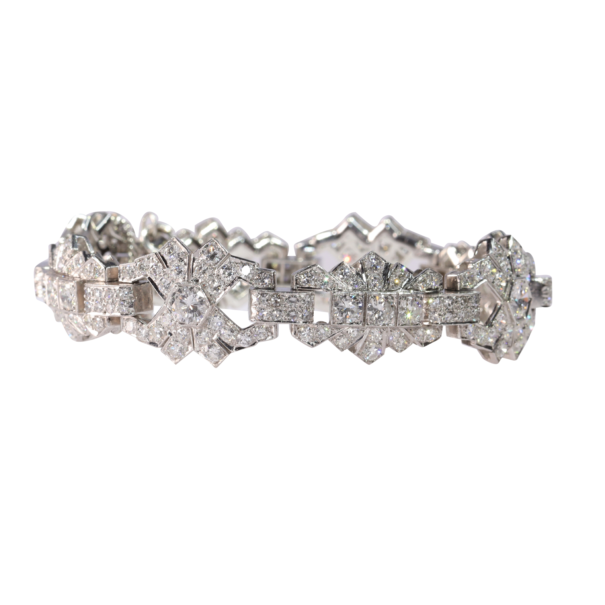 A resplendent bracelet, hailing from the 1950s, epitomises a seamless blend of Art Deco inspiration and the distinct lavishness of Retro style. Despite its Belgian essence, the piece bears no marks, its origins as mysterious as its craftsmanship is exquisite. It hosts a constellation of 256 diamonds, a symphony of brilliant cuts summing to approximately 12.24 carats. This luxurious platinum piece, in excellent condition, is not just a wrist adornment but a historical echo of the Fifties' elegance and the era's penchant for revisiting Deco sophistication.