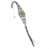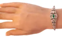 This vintage French Art Deco bracelet epitomizes elegance and exclusivity, dating back to around 1923. Crafted from platinum, it showcases meticulous craftsmanship. The bracelet boasts a stunning array of 83 diamonds, totaling approximately 6.93 carats, enhancing its splendor. Adding to its charm are 36 carre and baguette cut onyx stones, along with 13 emeralds, contributing to its allure.