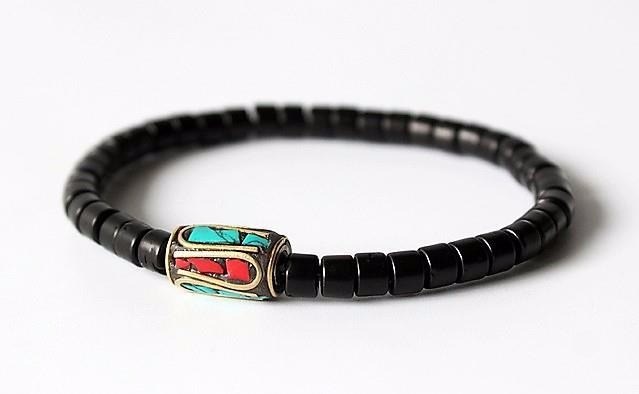 De donkere kralen van gepolijste kokosnoot vormen een fraai contrast met de fraai ingelegde sierkraal van goudkleurig koper. Deze handgemaakte armband van hoge kwaliteit is elastisch en is daardoor makkelijk aan en uit te doen. De donkere kraaltjes hebben een diameter van circa 5 mm. en de sierkraal is circa 12 mm. breed.