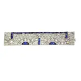This Art Deco platinum brooch features 72 old European and single brilliant cut diamonds in a captivating geometric design with millegrain detailing. Connecting three grand old European cut diamonds are 19 rectangular cabochon sapphires, while two half-moon cabochon sapphires, surrounded by diamond-encrusted flower petals, add a delicate touch. It's in excellent condition and believed to be of Belgian origin. This brooch embodies the Art Deco style's abstract motifs and geometric forms, originating in the 1920s. With a total diamond weight of approximately 4.44 carats and 21 cabochon polished sapphires, it's a timeless testament to antique jewelry's enduring beauty.