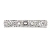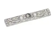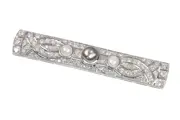 This elegant bar brooch, a quintessential representation of 1950s style, exhibits a harmonious blend of Art Deco influence and the Retro aesthetic. Crafted in platinum, it features 72 diamonds, intricately set to accentuate its sophisticated linear design. Three pearls add a touch of classic elegance, enhancing the brooch's timeless appeal. This piece, from an unknown origin, captures the essence of the era, showcasing the transition from the bold geometry of Art Deco to the more fluid lines characteristic of the 1950s. It embodies the perfect fusion of past influences and mid-century modernity.