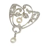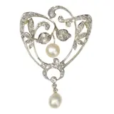 This antique Art Nouveau brooch, circa 1900, is a stunning example of the era's fascination with organic and flowing designs. Crafted in a combination of platinum and 18K yellow gold, it features 57 old brilliant cut diamonds and 13 rose cut diamonds, totalling 70 pieces, which elegantly capture the light. The design includes two natural saltwater pearls, adding a touch of refined elegance. Characterized by its 'whiplash' curves and floral motifs, this brooch is a quintessential representation of the Art Nouveau style, embodying the movement's ethos of making art a part of everyday life. Its intricate craftsmanship and harmonious design make it a timeless piece, reflecting the artistic and decorative innovation of the turn of the 20th century.