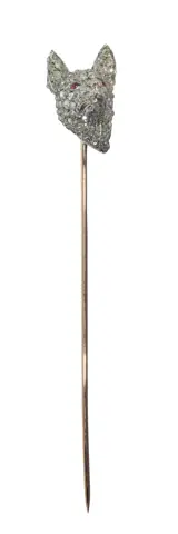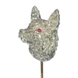 An exquisite Victorian tie pin from the Romantic Period circa 1860 exudes sentimentality and ornate craftsmanship. Crafted from 18k red gold and silver using the revered silver on gold technique, it features approximately 290 rose cut diamonds and senailles, and a pair of rubies, symbolising enduring love. With motifs evoking the era's fascination with nature, a dog's head theme emerges, enriched by gothic and renaissance patterns. This exceptional piece, in excellent condition, reflects the era’s opulence with intricate carvings and enamelling, a tribute to Queen Victoria's devotion. Its inspiration, drawn from Mother Nature and the era's poignant poetry and fashion, encapsulates a deeply symbolic and romantic essence.