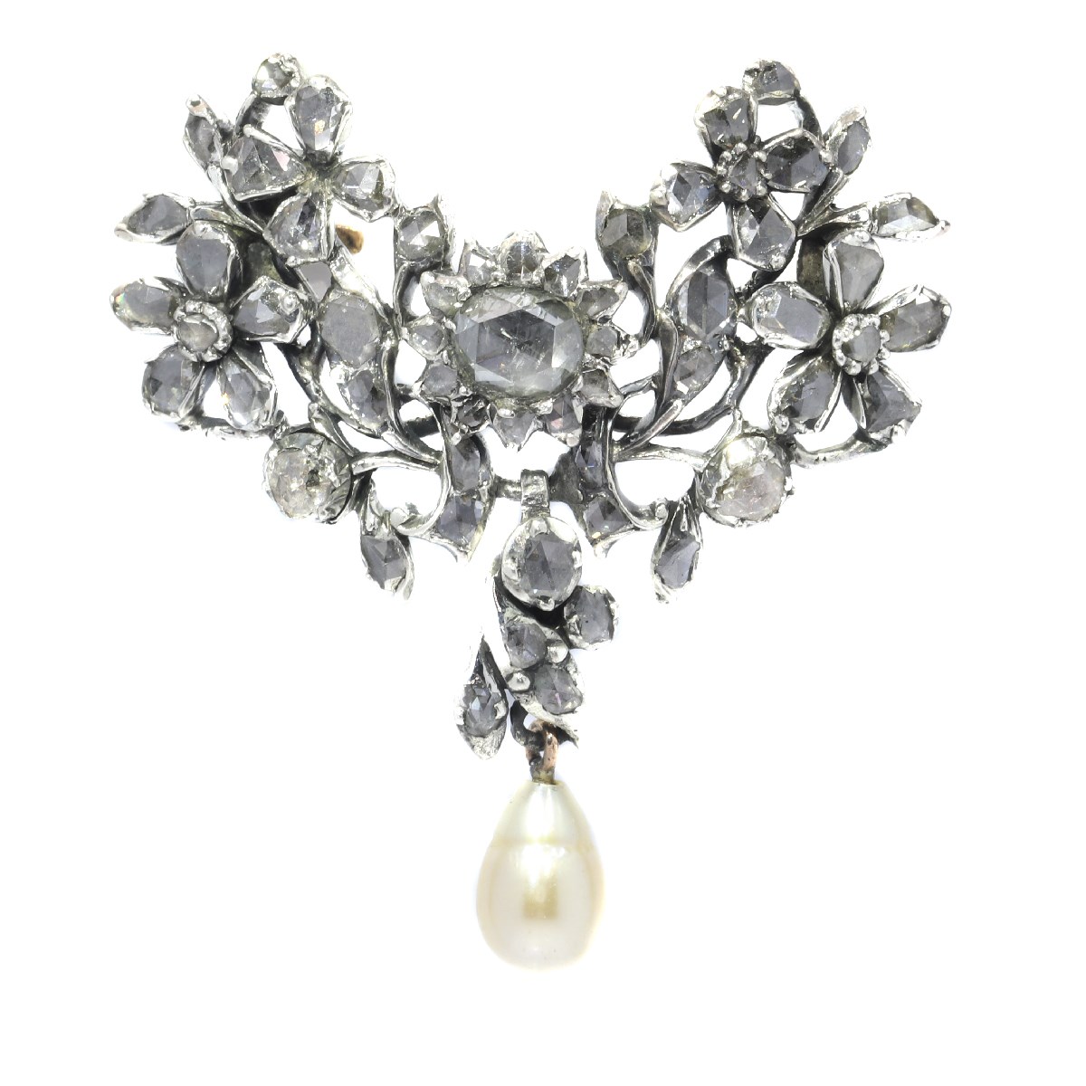 A splendid Georgian brooch from around 1740, rendered in silver with an 18K gold clasp, showcases the grandeur favoured by the noblesse. It features sixty rose-cut diamonds, each meticulously set upon foil—a testament to the period's high craftsmanship standards. The drop pearl at its centre is a subtle nod to the dignified elegance of the era's well-to-do. Though its precise lineage is unknown, the brooch's opulence hints at a past steeped in grace and affluence.