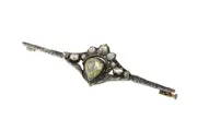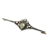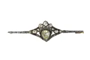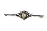 This exceptional bar brooch, crafted in 14K yellow gold with silver details, blends Victorian elegance with mid-20th-century craftsmanship. Its centrepiece is a remarkably large pear-shaped rose-cut diamond, surrounded by thirteen smaller rose-cut diamonds and senailles, all set on foil to enhance their lustre. The crowned heart motif, a timeless emblem of love and romance, adds symbolic depth to its intricate design. The setting for the central diamond appears to date from the early 19th century, while the brooch as a whole was created post-1952, likely incorporating antique elements. A true testament to enduring beauty and sentimentality.