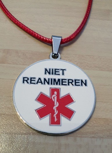 Deze medaillon heeft als opschrift: "NIET REANIMEREN" en een medisch teken.