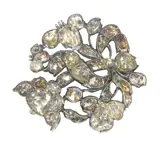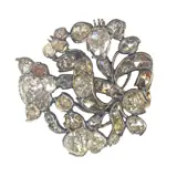 This Baroque-era brooch, dating back to circa 1680, captures the essence of its period with dynamic curves and symmetrical opulence. Composed of 18K red gold and adorned with 36 meticulously set rose cut diamonds, it reflects the era's love for light-enhancing foil techniques. The brooch is a testament to the vibrant artistry of the time, remaining in very good condition. Its craftsmanship is a reminder of the Baroque's spirited forms and the robust, ornate details that heralded the sophistication of Europe's artistic evolution.