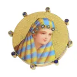 A splendid example of late 19th-century craftsmanship, this brooch elegantly bridges the Late-Victorian and Belle Époque styles. Originating from Belgium, it features a captivating Bedouin woman motif, rendered in exquisite 18K yellow gold with expert enamelling. Adorned with nine rose cut diamonds and senailles, alongside four sapphires, the piece reflects the era's transition from opulent to more refined, romantic designs. Its intricate details and historical significance make it a treasured find for collectors and enthusiasts of antique jewellery. The brooch exudes a sense of Orientalism, shrouded in mystery and arousing curiosity about its origins and the story behind its creation.