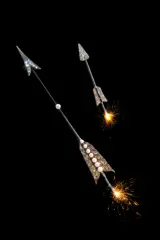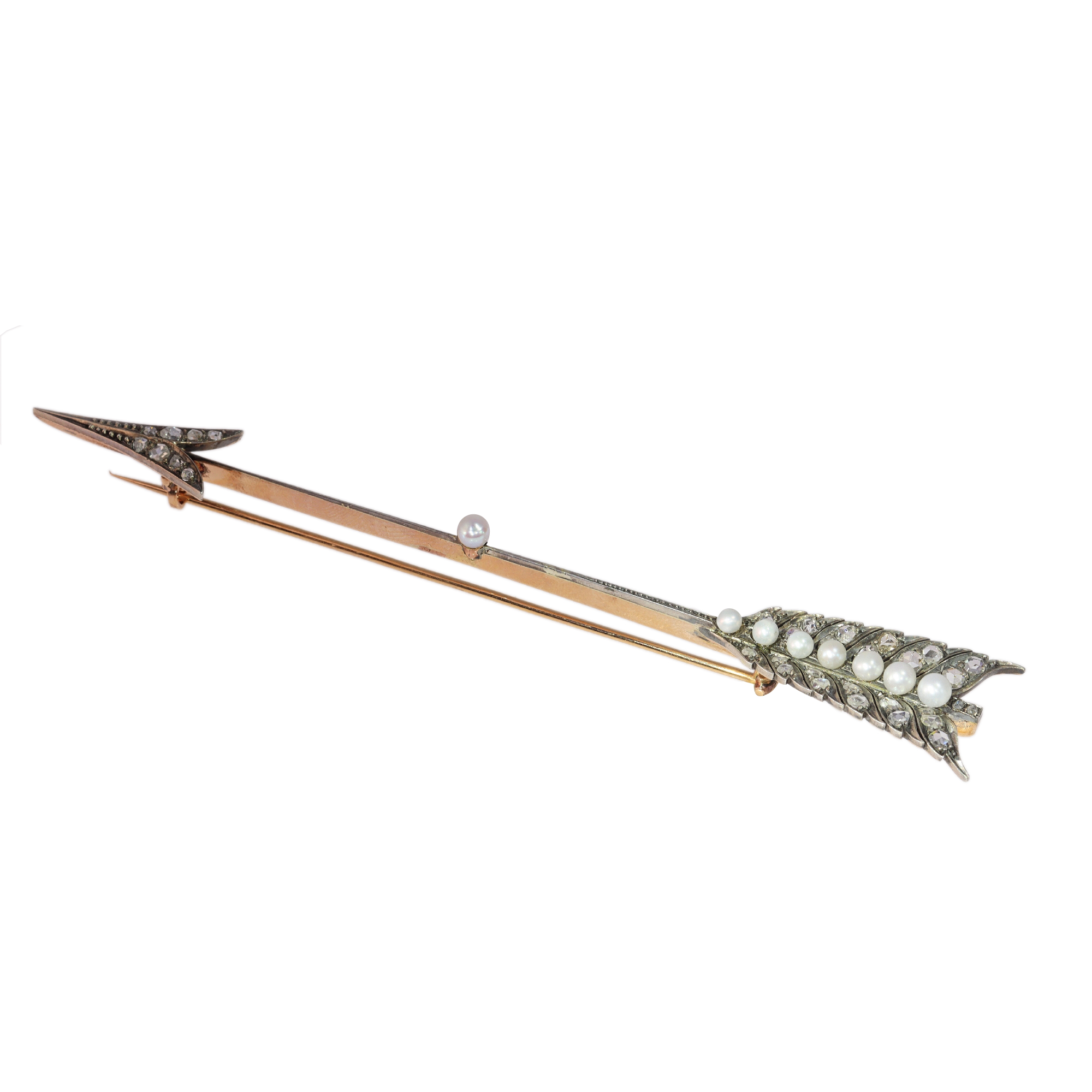 Bearing the sentimental weight of the Grand Victorian era, this Belgian-crafted arrow brooch, festooned with 34 rose-cut diamonds and eight natural pearls, is a relic of 1870—a token of longing captured in 18k pink gold and silver. More than mere adornment, it serves as a silent accomplice to Cupid's endeavours, a poignant gift that whispers to the heart's deepest desires, aiming with precision at the cherished target of affection and remembrance.