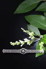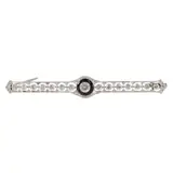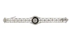 A paragon of Art Deco sophistication, this bar brooch, circa 1920, presents a harmonious blend of platinum and 18K white gold. Its abstract motifs and precise geometrical forms echo the era's departure from organic to the decisively modern. Adorned with 67 diamonds, including a central old brilliant cut of approximately 0.42ct, complemented by old mine cuts and rose cut diamonds, it captures the essence of the Roaring Twenties—elegant, glamorous, yet functional. A single onyx accentuates its bold, decorative statement, cementing its status as a collectible piece of that opulent epoch.