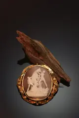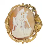Elegant Victorian Era Cameo Brooch: This vintage antique cameo brooch, set in 18K yellow gold, features a detailed portrayal of "The Farnese Bull," a monumental Roman sculpture. Crafted during the Romantic Victorian Period (circa 1850), it reflects the era's sentimental and symbolic style. The cameo technique, using contrasting materials to create a raised relief image, is expertly employed here. With its intricate design and historic significance, this brooch is a delightful piece of artistry and history. Antique jewelry object group