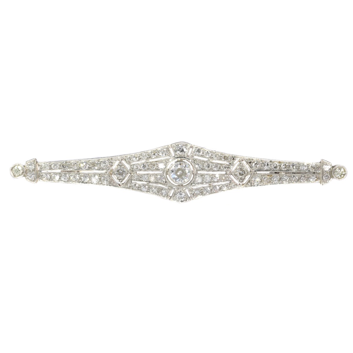 This vintage platinum Art Deco bar brooch, a radiant testament to the 1930s, is a masterpiece of design and elegance. Comprising 71 diamonds, its composition reflects the era's fascination with abstract motifs and geometric forms. The brooch, a product of the Art Deco movement, showcases the period's transition from the organic to the architectural, symbolising the blend of glamour and functionality that defined the time. This piece is not just a brooch; it's a sparkling homage to a transformative era in art and design, encapsulating the spirit of the Roaring Twenties with its dazzling display of craftsmanship.