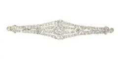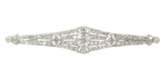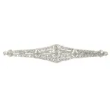 This vintage platinum Art Deco bar brooch, a radiant testament to the 1930s, is a masterpiece of design and elegance. Comprising 71 diamonds, its composition reflects the era's fascination with abstract motifs and geometric forms. The brooch, a product of the Art Deco movement, showcases the period's transition from the organic to the architectural, symbolising the blend of glamour and functionality that defined the time. This piece is not just a brooch; it's a sparkling homage to a transformative era in art and design, encapsulating the spirit of the Roaring Twenties with its dazzling display of craftsmanship.