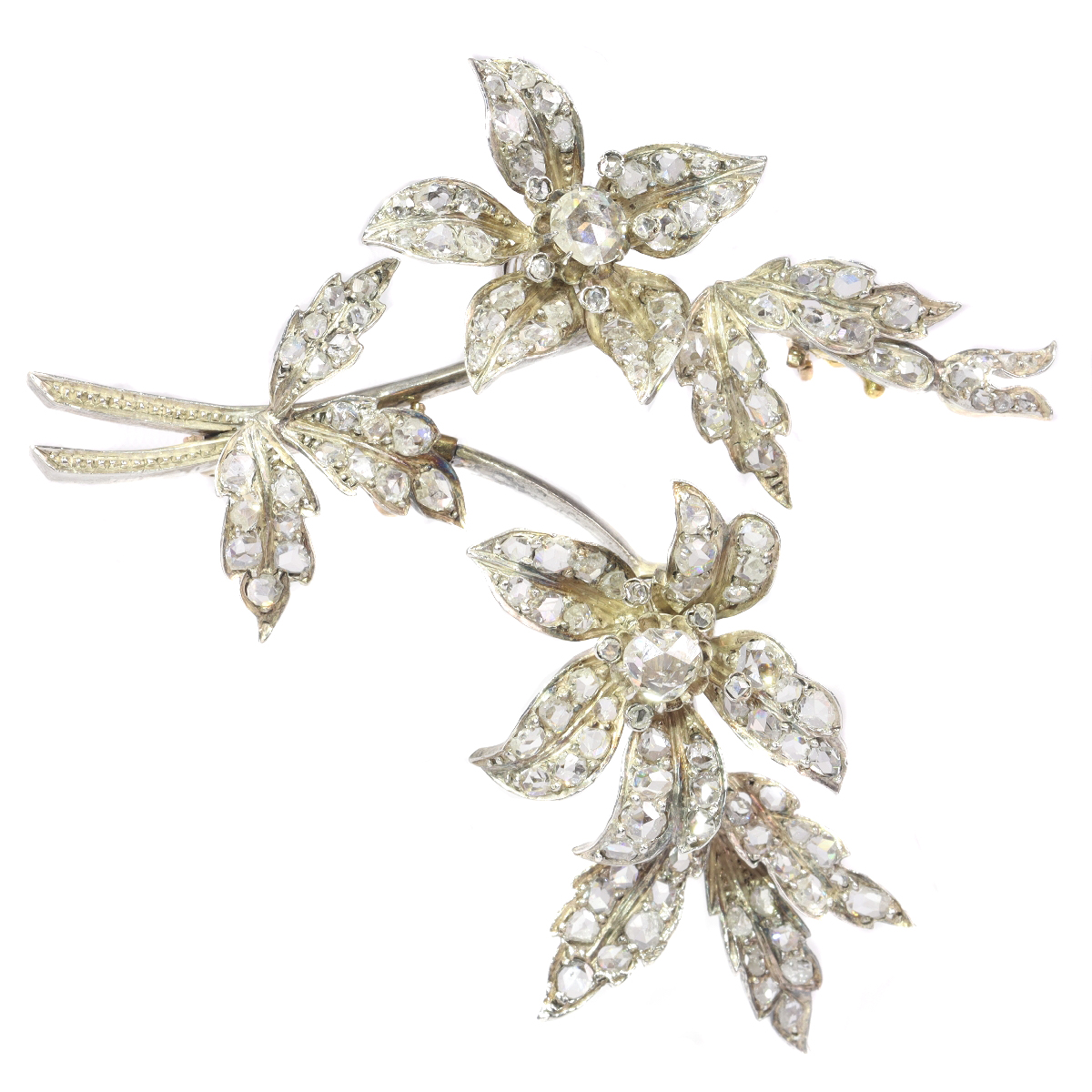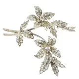 An exquisite example of Romantic Victorian artistry, circa 1850, this brooch en tremblant is fashioned from 18k pink gold with silver accents. It encapsulates the era's sentimental value through a flower branch motif, alive with 143 rose cut diamonds and senailles, set to tremble with every movement. Drawing inspiration from nature and symbolising the love and devotion of Queen Victoria's early reign, its intricate craftsmanship reflects a period where opulence was achieved with less. This brooch is a testament to a time of profound romanticism and expressive design.