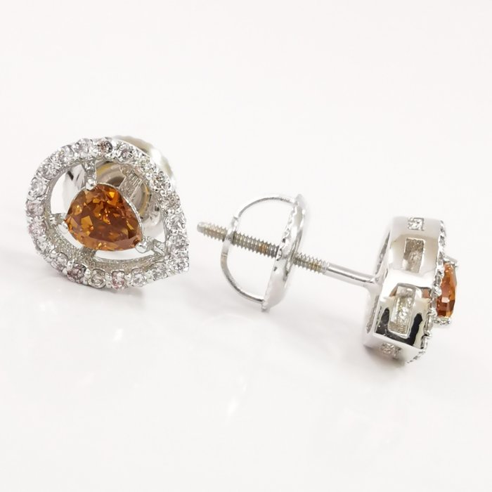 14k witgoud 0,40 ct vs fancy bruinachtig oranje & 0,26 ct lichtroze diamanten designer halo oorknopjes