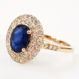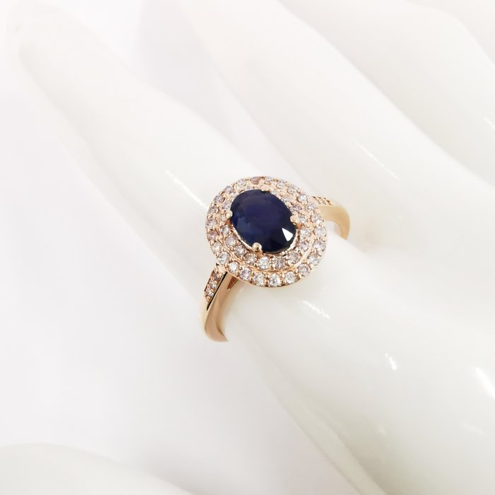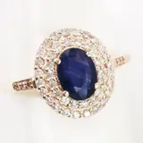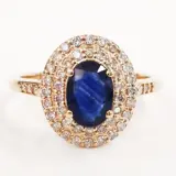 14k roségoud 1,00 ct blauwe saffier en 0,38 ct fancy roze diamanten ontwerper dubbele halo ring