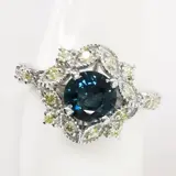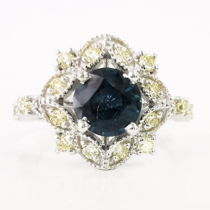 14k witgouden designerring met 1,22 ct blauwe saffier en 0,35 ct vs fancy gele diamanten