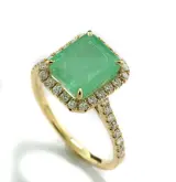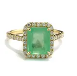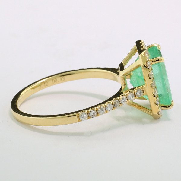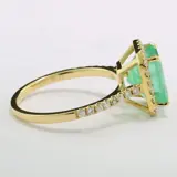 met een groene smaragd ca. 3,42 ct, transparante kwaliteit, achthoekig geslepen, gefacetteerd à jour (smaragd alleen geolied zoals gebruikelijk in de handel). Frame en ringschouders bezet met 38 briljant geslepen diamanten van in totaal ca. 0,43 ct, kleur: H / zuiverheid: SI-I1, prachtige schittering. Hoogwaardige, eenmalige productie in 750/18 karaats geelgoud, gehalte en edelsteengewicht gemerkt.