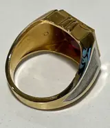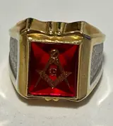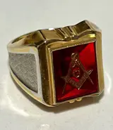 Uitzonderlijke maçonnieke gouden ring uit het begin van de 20e eeuw met rode cabujon sinthetyc rode edelsteen en vrijmetselaarssymbool
