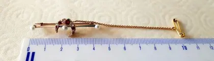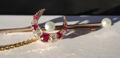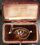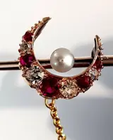 Prachtige oude unisex broche, 14k geel goud, 5 natuurlijke robijnen van uitstekende kleur en zuiverheid, 4 prachtige oude briljant geslepen diamanten, 3 natuurlijke parels. Jaren 1809-1912 originele doos inbegrepen ondertekend George Davidson, Watch Maker & Jeweller, 48 Ann Street, Dundee-Scotland Broche 49 mm, veiligheidsketting 75 mm. Uitzonderlijk stuk.